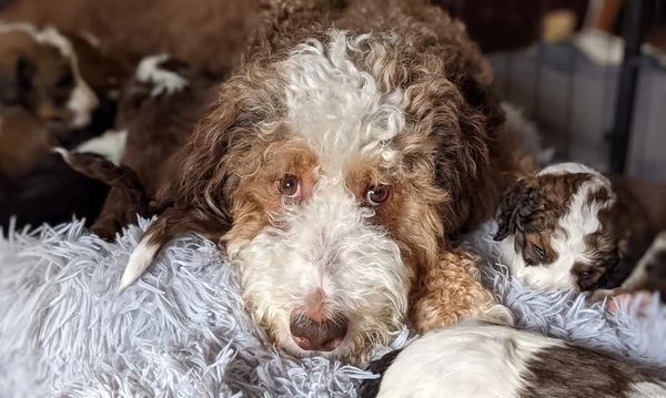 Our beautiful Tali is an F1 Standard Bernedoodle who retired from our program in 2020, after bringing 3 gorgeous litters of Bernedoodles into the world. Tali is now living out the rest of her many years with her former guardian, now sole owner, and her handsome F1b Bernedoodle son, Liam, from her 2nd litter. We have had the pleasure of keeping three of Tali's daughters in our program: Lola, Astrid & Rae, and we are so excited for their future with us!